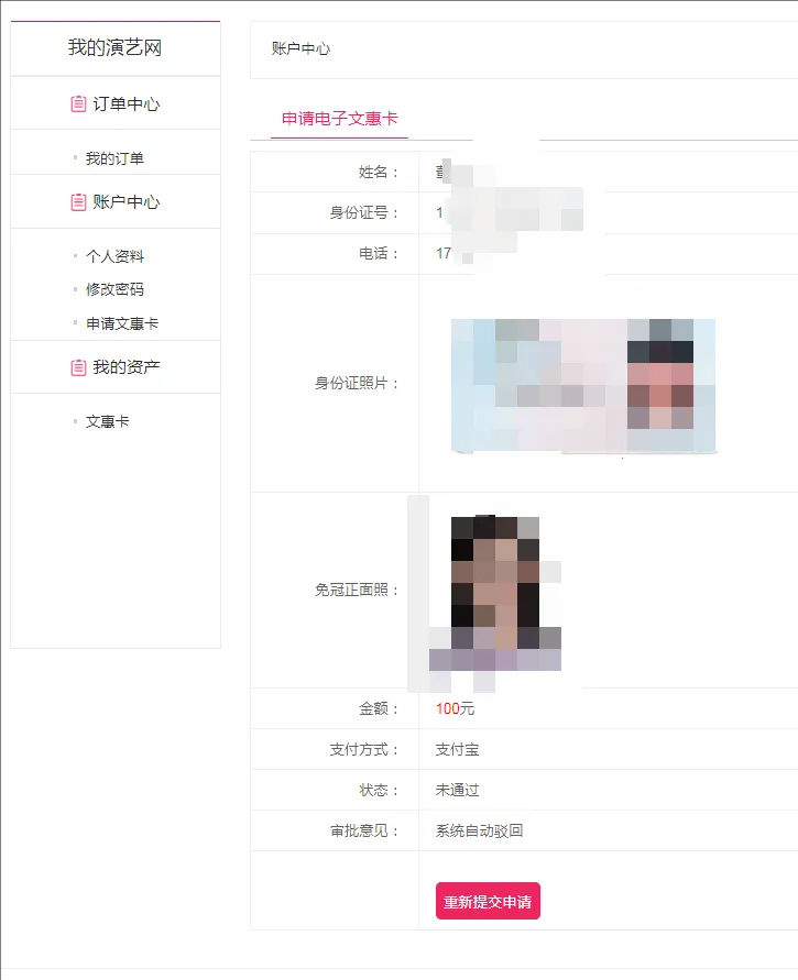 4.等待审核结果,审核不通过可以点击【重新提交申请】再次提交信息;审核通过后点击【缴费】,缴费完成后,即可办理成功,点击【我的资产-文惠卡】可以查看文惠卡信息。