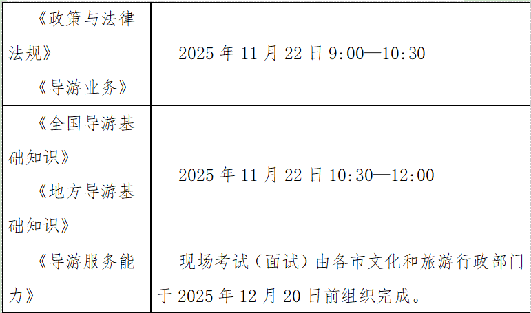 根据《文化和旅游部办公厅关于组织实施2025年全国导游资格考试的通知》,2025年全国导游资格考试定于2025年11月22日(周六)举行。为确保考试顺利实施,现将有关事项通知如下: