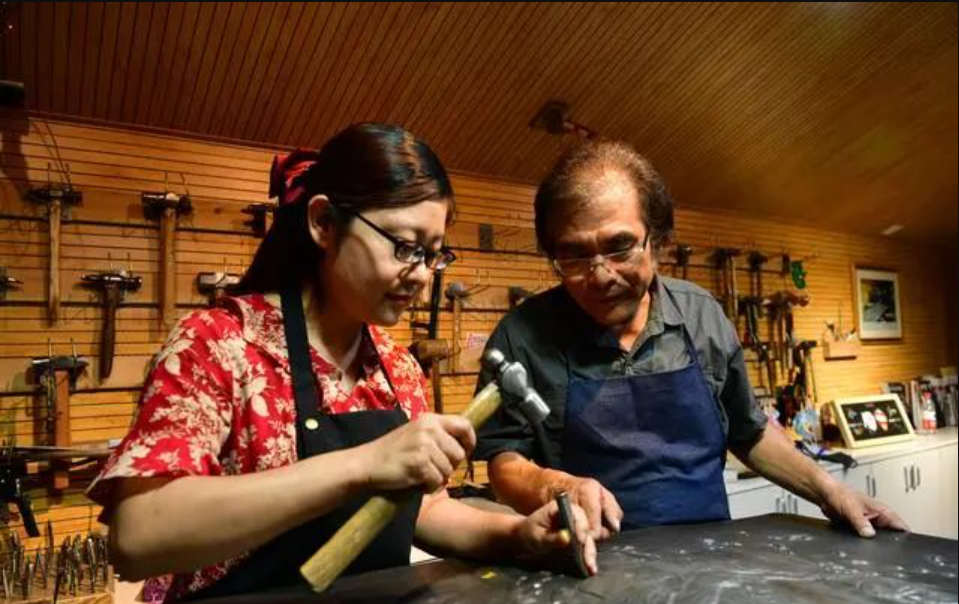 在叮当锤声中长大的“88后”郭墨涵,自幼便与铁板浮雕结缘。她的第一件作品——用铜板下脚料锤出的牛头,让父亲郭海博看到了传承的希望。