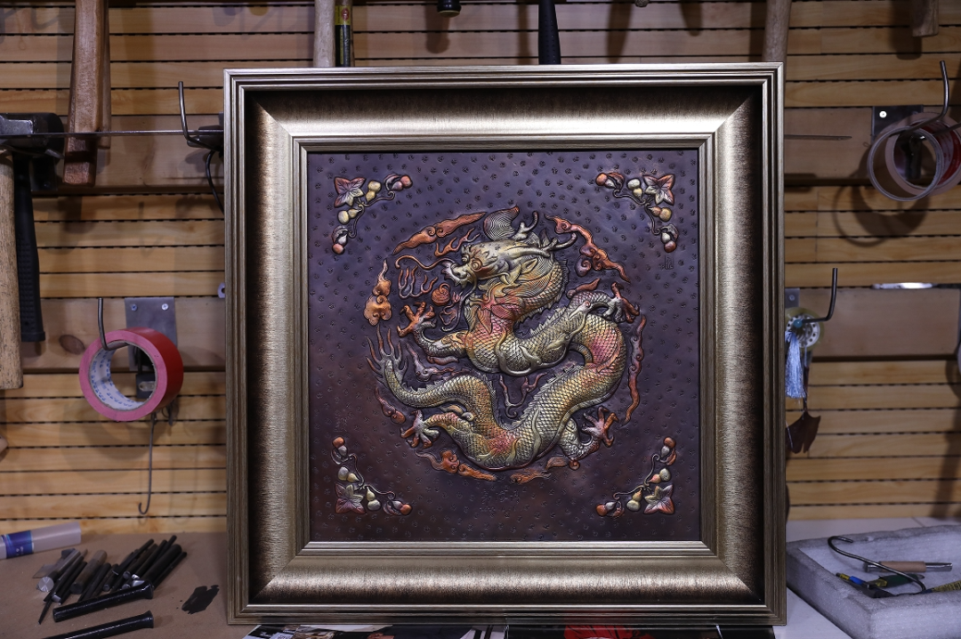 三十余年间,郭海博还在紫铜浮雕的基础上研发独创出彩铜浮雕烧色技法,从设计稿样、拓稿勾线,到锤锻塑形、烧色打蜡,十余道工序环环相扣,最终让冰冷的金属焕发出油画般的层次感与雕塑的厚重感。