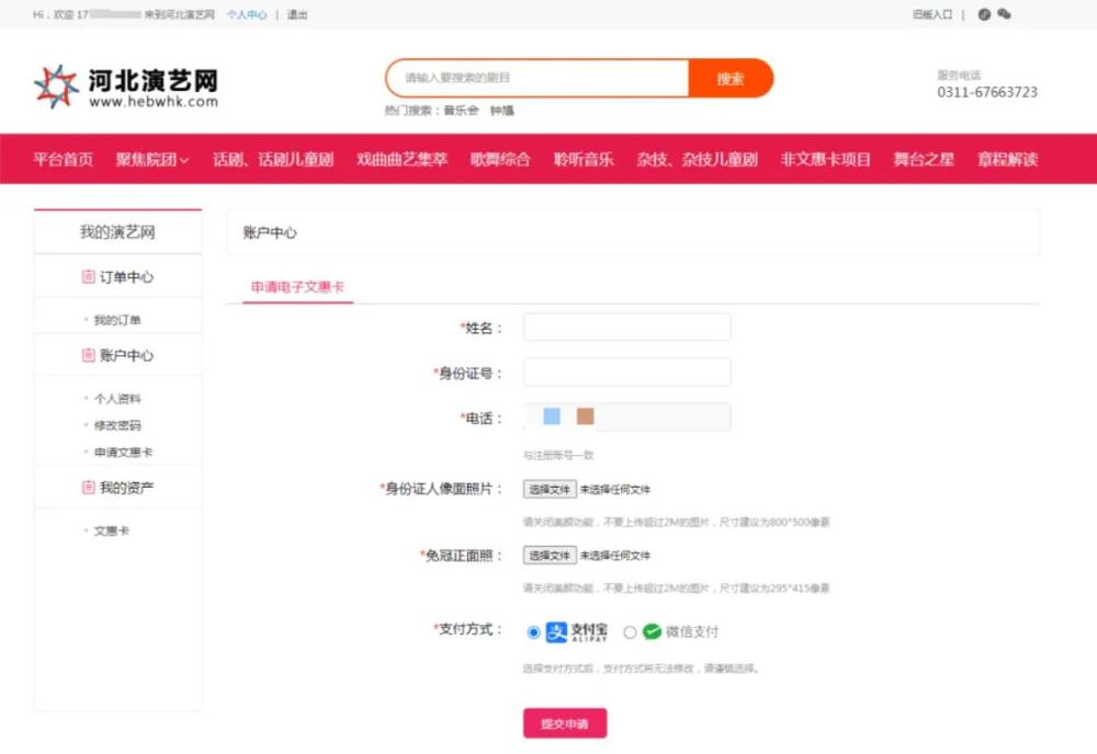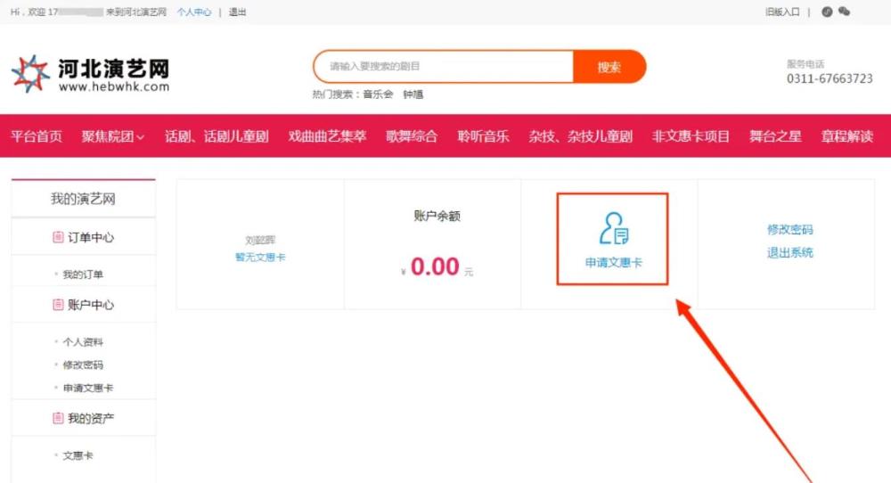 1.进入河北演艺网“www.hebwhk.com”2048核基地,登录账号,点击【个人中心】进入“我的演艺网”页面;