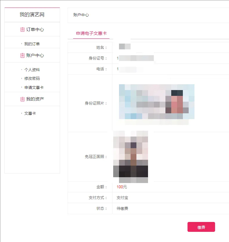 4.等待审核结果,审核不通过可以点击【重新提交申请】再次提交信息;审核通过后点击【缴费】,缴费完成后,即可办理成功,点击【我的资产-文惠卡】可以查看文惠卡信息。