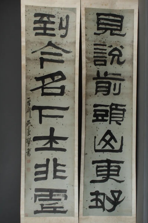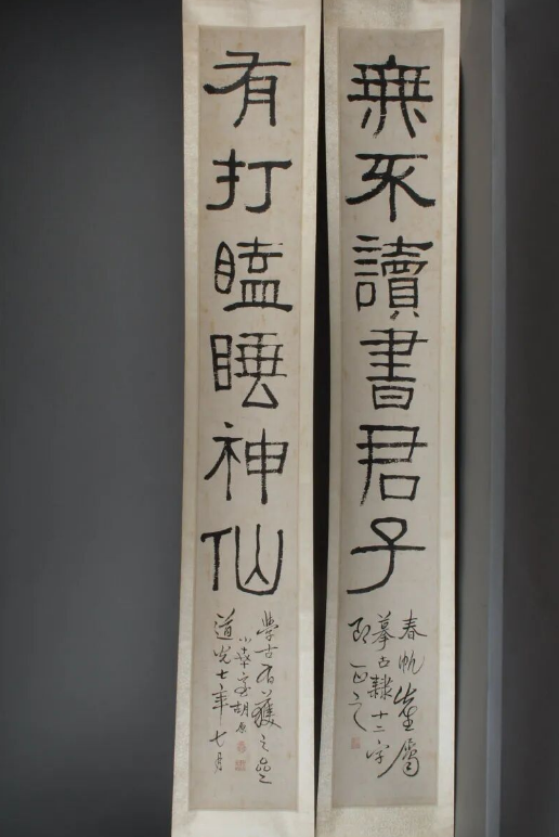 清代中晚期碑学兴起的艺术变革尤为鲜明,“金石古韵・篆隶新风”展柜中,碑学开派巨擘邓石如的篆书对联笔力雄浑,融秦篆庄重与汉篆灵动;胡原、吴廷康等书家的隶书作品各具韵味,尽显金石与古体的碰撞之美。